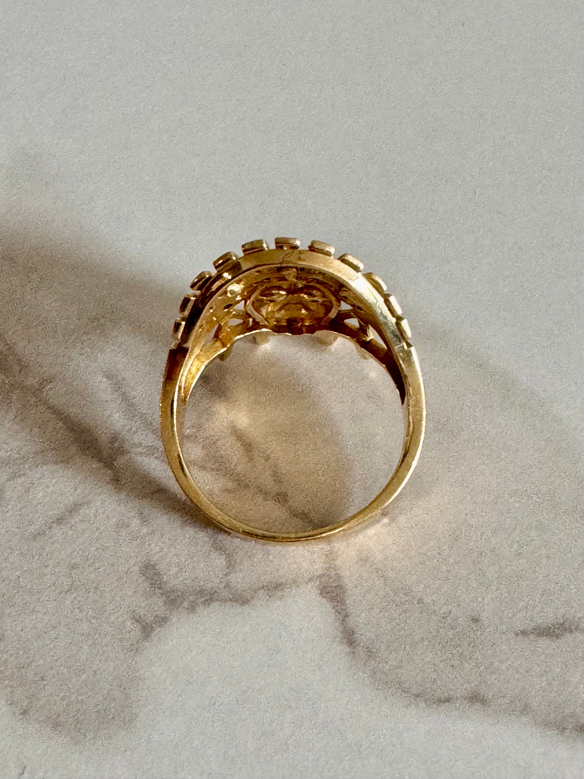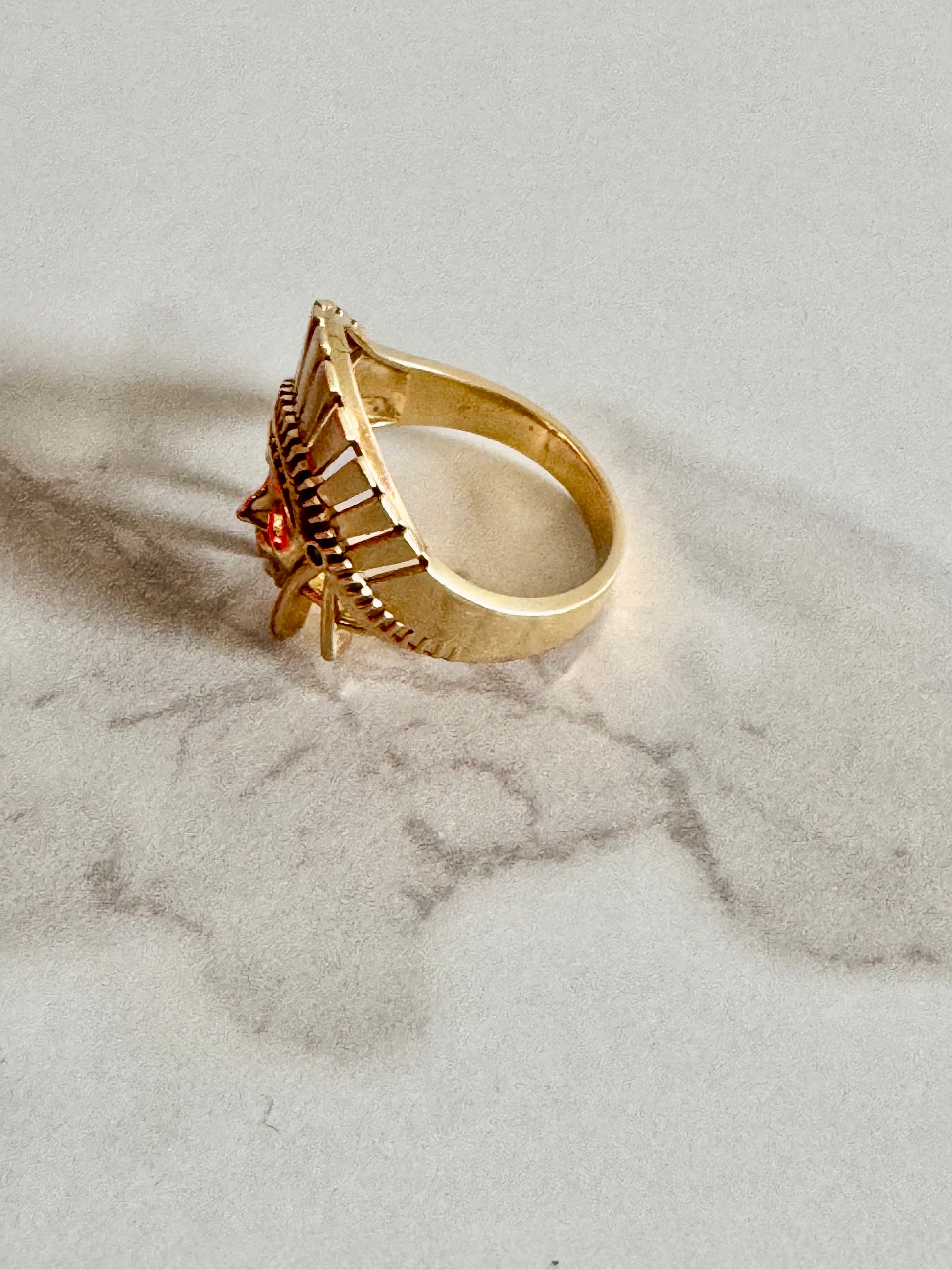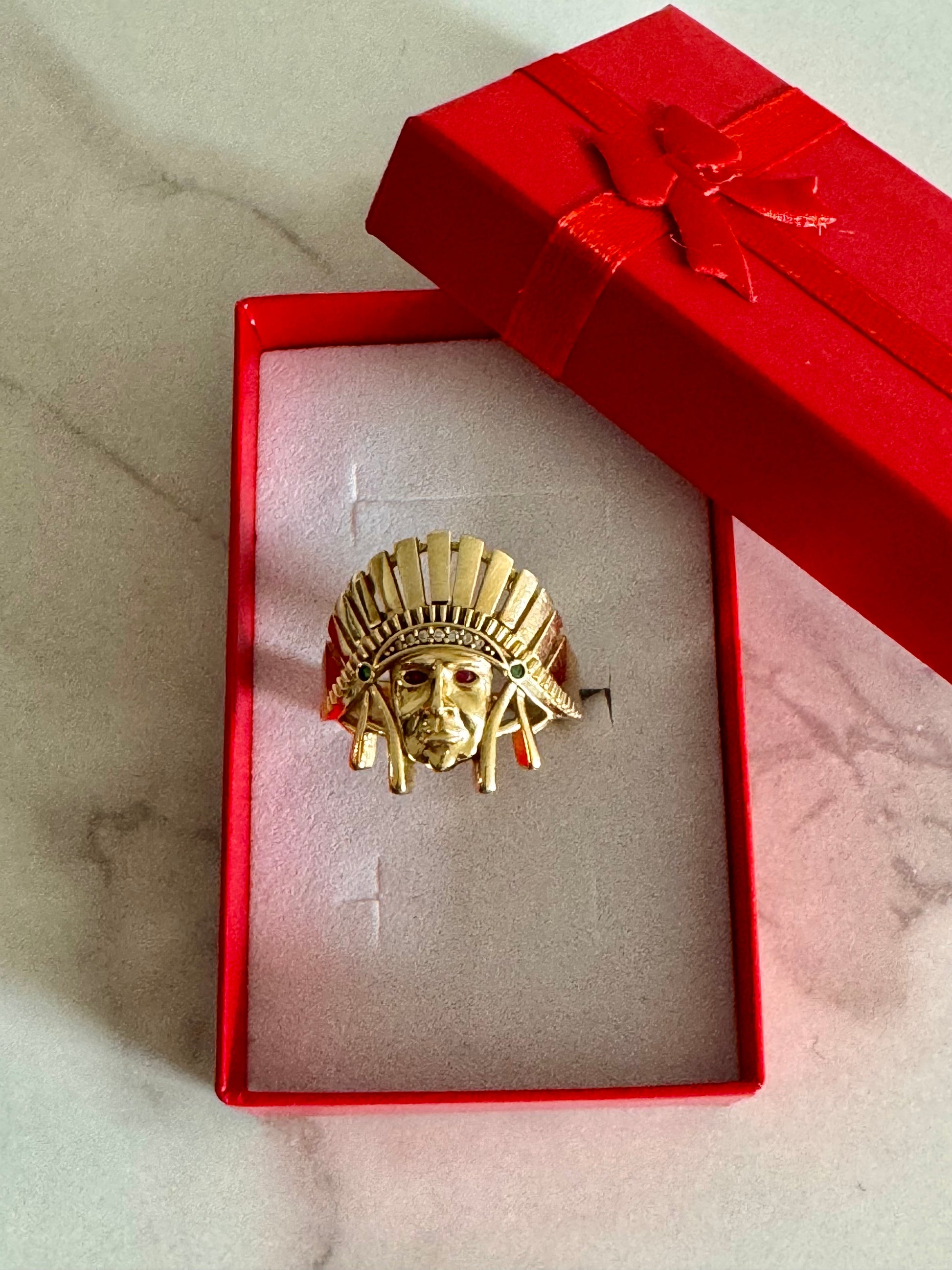 Bold and powerful, this 10k gold men’s ring features a striking chief head design with intricate details and red accent stones. A standout piece that celebrates heritage and strength—perfect for those who wear their pride with style.