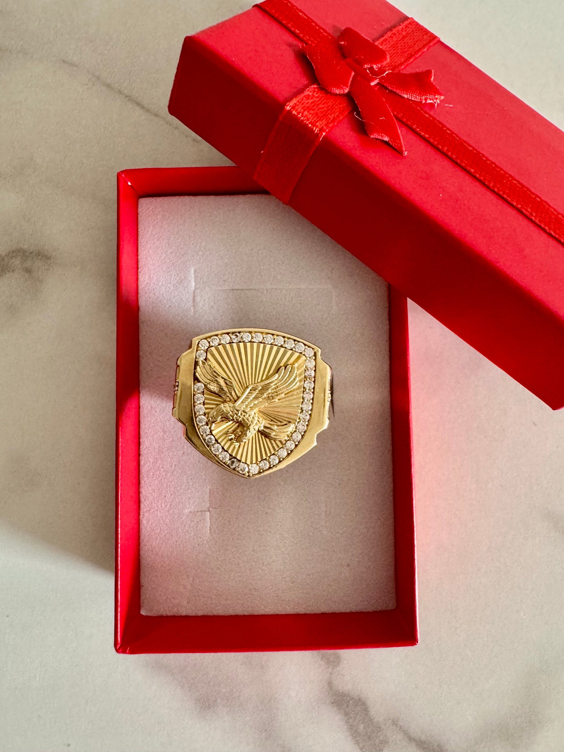 Command attention with this bold men’s ring, featuring a radiant eagle design over a shield-shaped base. Crafted in genuine 10k gold and framed with sparkling stones, this piece combines strength, heritage, and brilliance.